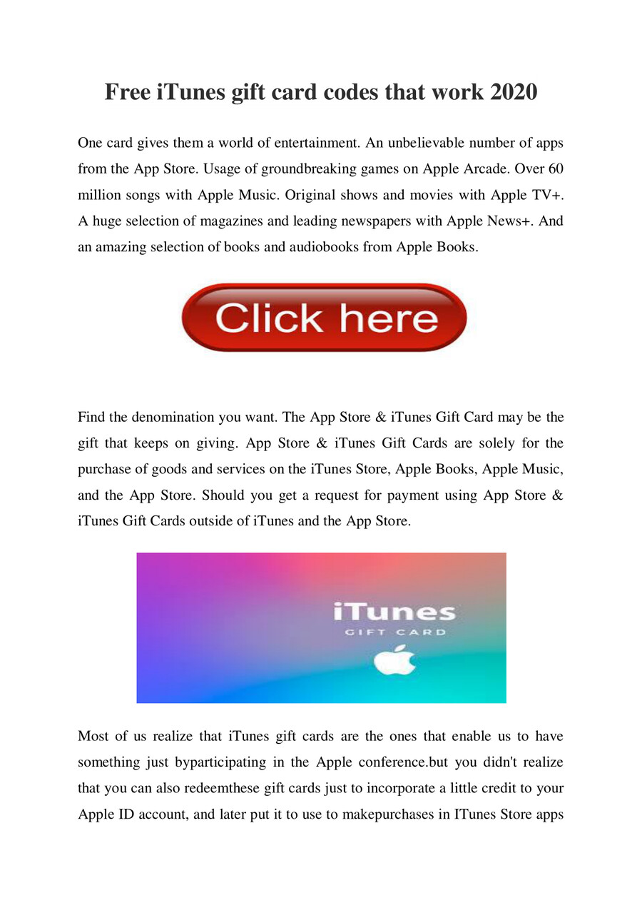 Free itunes gift card codes that work 2020(latest update free itunes gift card codes. The free apple store gift card will be mailed on your given email id which you can redeem anytime with in year or gift to your relative / loved one's.